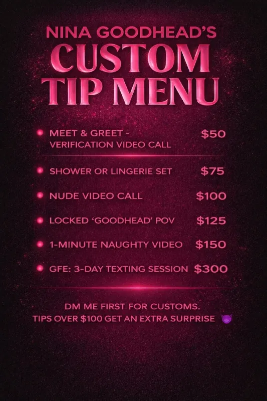 Ready to unwind with something a little… extra I’m now offering both INCALL & OUTCALL💕 If you’ve never booked before, now’s your chance to try me. I give amazing massages...enjoy fetishes & ❤ to shake my big beautiful ass just for you.. I promise by the time we're finished... you'll feel like a new man and you will be very adamant about seeing me again...and again. Need satisfaction RIGHT NOW❓ 📲SUPER Slutty Sexting Sessions 🤳🏾Live NUDE Video Calls...Yes I have Toys 😉 🎬UNCENSORED Onlyfans X-Rated Content I know what your thinking cause I'm thinking it too. The night is young and you only live once. Why not live it with the girl of your dreams. 💋Nina ONLYFANS: onlyfans.com/ninagoodhead FETISH FANVUE: fanvue.com/ninagoodhead SNAPCHAT: @NinaGoodheadXO X & PORNHUB: @NinaGoodhead ALL MY LINKS: allmylinks.com/goodheadnina